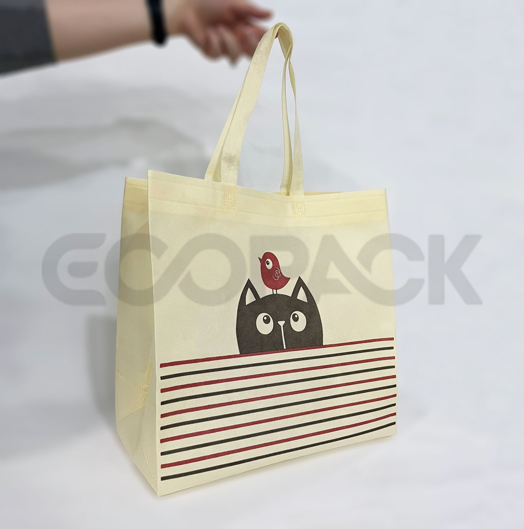 Gıda sektörüne uygun nonwoven bez çanta modelimizdir. %100 yerli üretim olan Nonwoven alışveriş çantası çevre dostu ve ekonomiktir. Plastik poşet kullanımını azaltıp çevreyi korumayı amaçlar. Devamlı kullanıma uygun ve dayanıklıdır. Market, eczane, fuar alanları vb. yerlerde kullanabileceğiniz çantalarımız dilediğiniz renk, gramaj, ölçü ve baskı ile üretilebilir. Flekso ve laminasyonlu baskı seçeneklerimiz mevcuttur. Flekso baskıda maksimum 4 renge kadar baskı yapılırken, laminasyonlu baskıda 8 renge kadar yapılabilmektedir. Baskı alanında renge ve boyuta göre değişiklik olabilmektedir. Siyah renk kumaşlı çantalarda en sağlıklı şekilde gümüş ve altın renk baskı yapılmaktadır. Kumaş rengine göre minimum adette değişiklik olabilir. Yapılacak çantanın grafik çalışması müşteriye iletilir. Onay aldıktan sonra baskıya girilir. Baskı onayı da alındıktan sonra üretime başlanır. Teslim süresi iş programına göre değişmekte olup yaklaşık 30 gün sürmektedir. Günde yaklaşık 80.000 adet çanta üretimi yapılmaktadır.